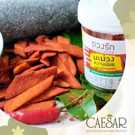 มะม่วงอบแห้งคลุกแจ่วปลาร้าทรงเครื่อง-ซีซ่าฟูดส์ มะม่วงอบแห้งคลุกแจ่วปลาร้าเป็นขนมขบเคี้ยวที่ผสมผสานรสชาติหวานของมะม่วงกับรสจัดจ้านของแจ่วปลาร้า สร้างประสบการณ์การรับประทานที่แปลกใหม่และอร่อย ที่มาของมะม่วงอบแห้งคลุกแจ่วปลาร้า สวนมะม่วง "ตวงรัก" ในจังหวัดกำแพงเพชร ได้พัฒนาสูตรมะม่วงอบแห้งรสชาติไทย โดยมีรสชาติที่หลากหลาย เช่น แจ่วปลาร้า กะปิหวานไฮโซ และยำแซบ จำหน่ายผลไม้อบแห้ง-ผักอบแห้งคุณภาพพรี่เมี่ยมเกรดส่งออก OTOP มี อย. มาตรฐาน GMP, HACCP, Halal คัดสรรผลไม้จากสวนเกษตรปลอดภัยมาตรฐาน GAP รับผลิตผลไม้อบแห้งสร้างแบรนด์ พร้อมบริการครบวงจร Manufacturer of Dehydrated Fruits Product Branding for OEM Service